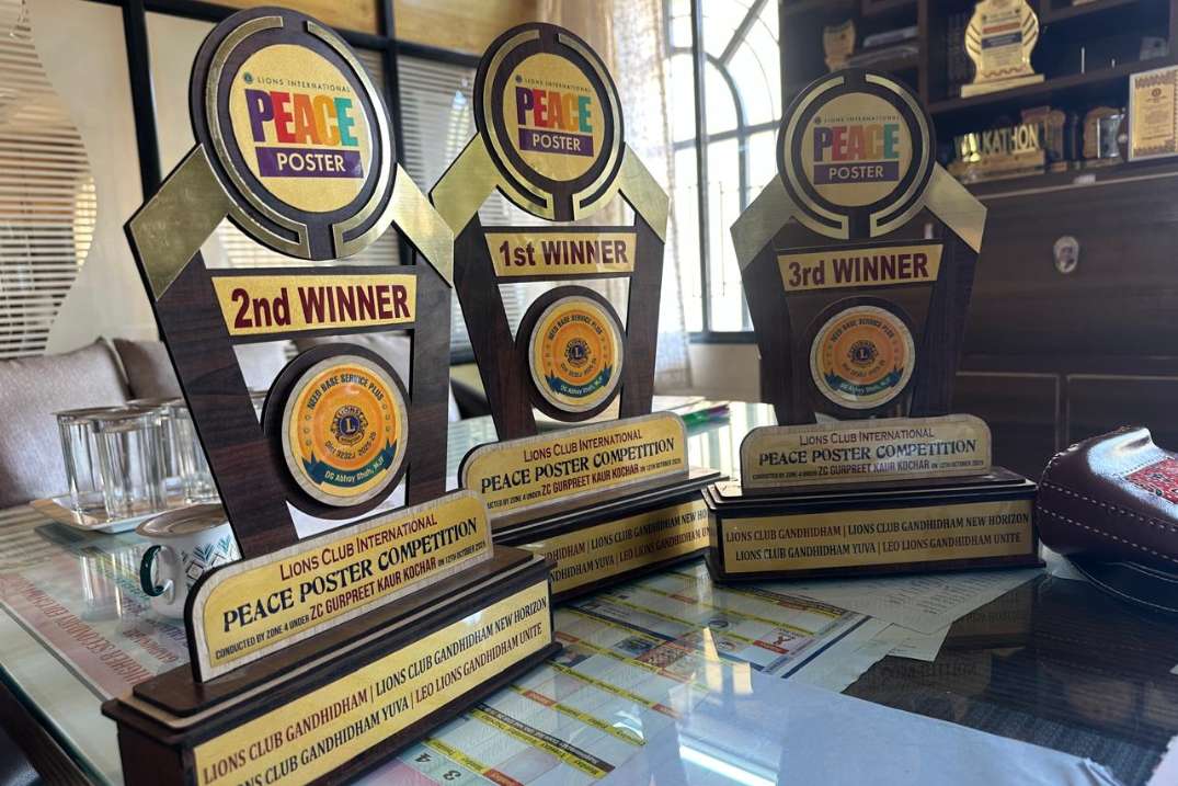 Zone 4 - r Organised peace poster competition conducted at excelsior model school, Adipur, 3 winners r felicitate by trophy by all 4 lions clubs of zone 4 under zc Gurpreet Kaur kochar, Lions club gandhidham new horizon 4 members r taking participation for delevering the prizes to students and encourage them to be participating every year